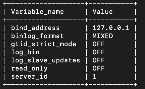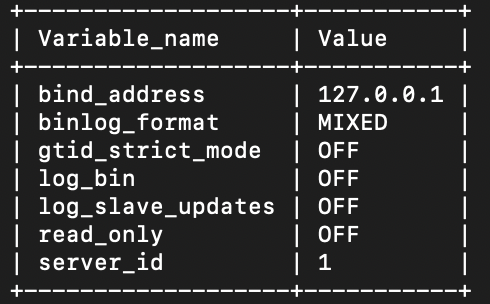 -> ('server_id','log_bin','binlog_format','gtid_strict_mode','log_slave_updates','read_only','super_read_only','bind_address');