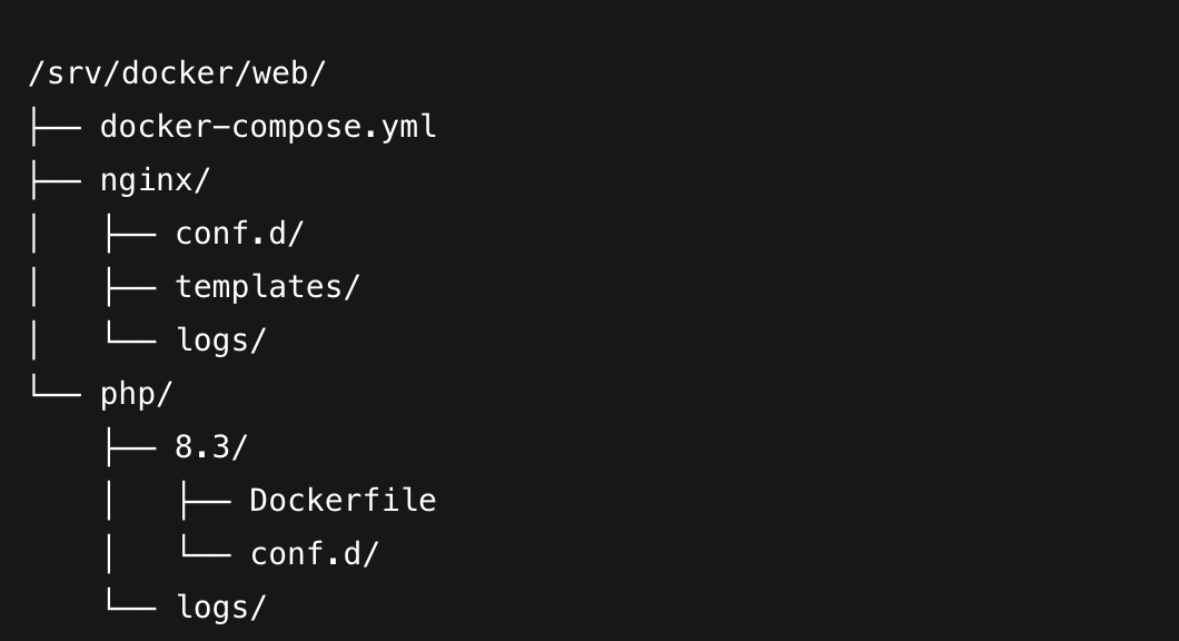 nginx/conf.d/: vhost, upstreamphp/*/conf.d/: override php.ini (memory_limit, upload_max_filesize…)logs/: log tách riêng để dễ debug và rotate