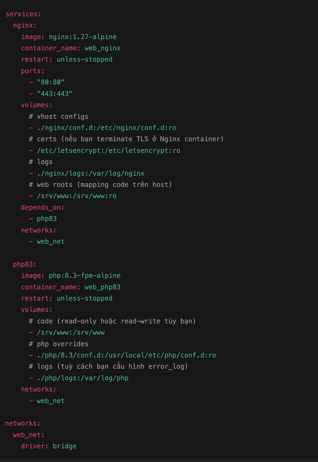 Dưới đây là mẫu docker-compose.yml tối giản nhưng đủ dùng production (có network, volumes, restart policy).