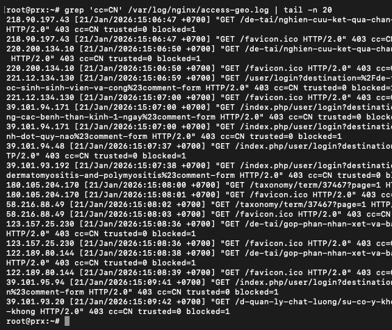 Trong hệ thống của mình đang dùng Reverse Proxy, và có nhiều truy cập không mong muốn từ Trung Quốc. Đây là các máy họ crawl dữ liệu, chắc cho AI, chỉ tốn tài nguyên. Do đó mình cần chặn.