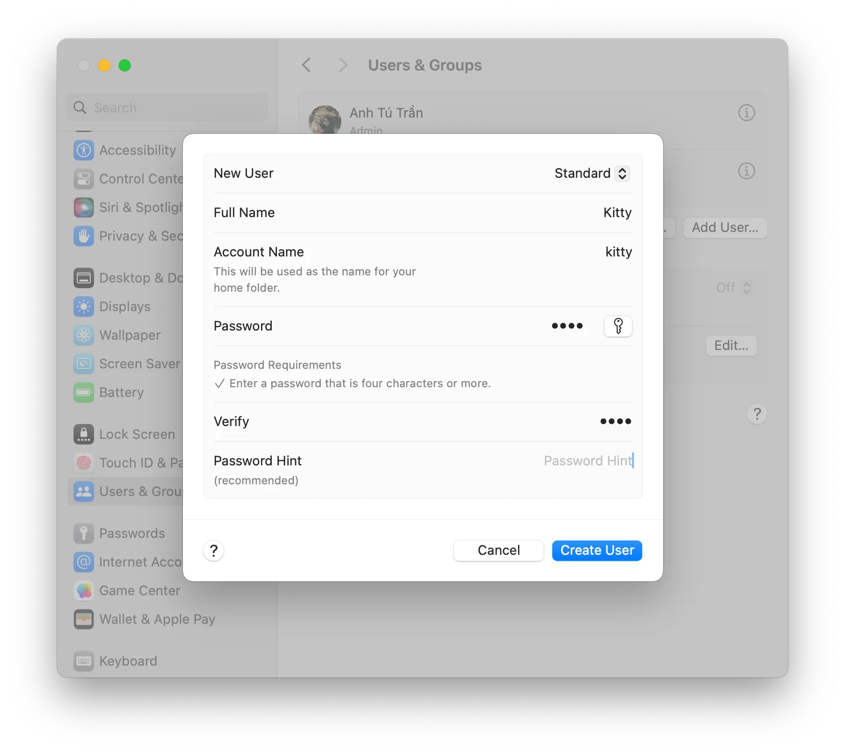 - Lúc này anh em phải nhập mật khẩu máy Mac để thêm User mới