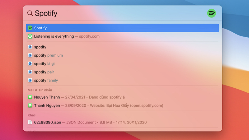 Nhưng với Mac, anh em có một công cụ tìm kiếm rất mạnh là Spotlight, anh em chỉ cần sử dụng phím tắt Cmd + Space. Với Spotlight, anh em có thể tìm rất nhiều thứ kể cả trên internet hoặc local. Nó hiện nhiều option cho anh em lựa chọn, thường sẽ ưu tiên thông tin từ những ứng dụng mặc định.