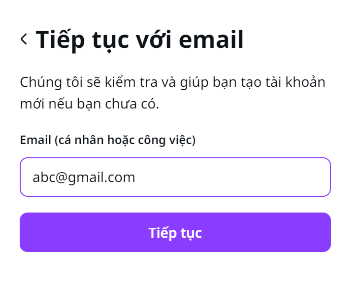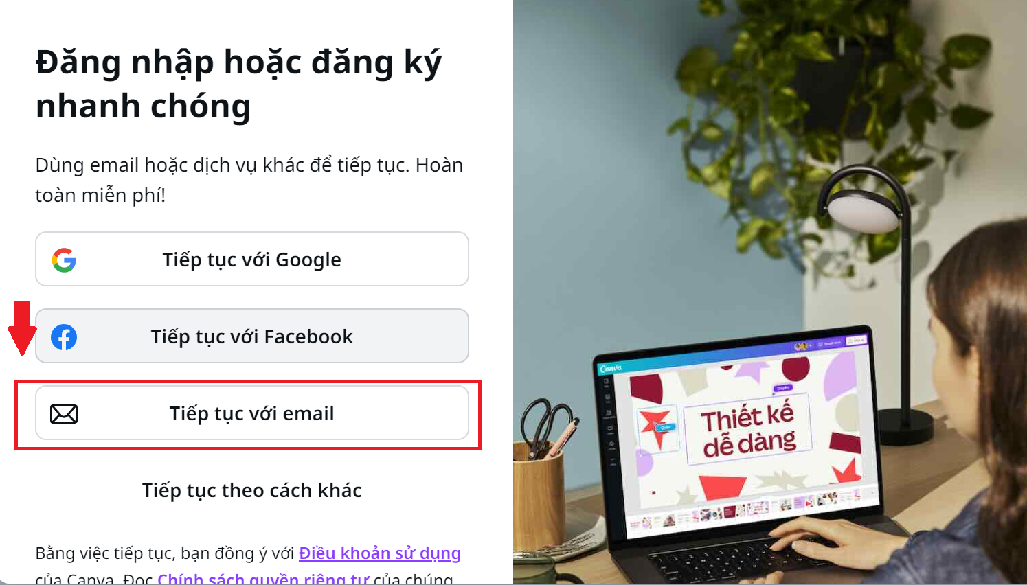 - Sau đó Canva sẽ đưa cho bạn một số phương thức đăng ký khác nhau để bạn có thể lựa chọn.Chọn tiếp tục với Email để đăng ký tài khoản của bạn bằng gmail.