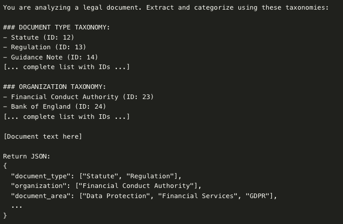 "Data Protection"→ tìm thấy ID thuật ngữ42,"Financial Services"→ tìm thấy ID thuật ngữ87,"GDPR"→ tìm thấy ID thuật ngữ156. Sau đó, tài liệu được gán một mảng các ID:[42, 87, 156]. - Đối sánh ngữ nghĩa: AI hiểu “cho vay tiêu dùng” = “Các tổ chức cho vay tín dụng tiêu dùng” ngay cả khi không có sự trùng khớp chính xác giữa các từ khóa. Phương pháp dựa trên tên cho phép AI sử dụng khả năng hiểu ngữ nghĩa của mình để đối sánh các khái niệm, trong khi hệ thống đảm bảo độ chính xác thông qua việc đối sánh chính xác tên thuật ngữ trong quá trình tra cứu phân loại.