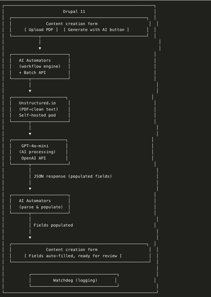Thay vì tự xây dựng mã tích hợp AI từ đầu, chúng tôi đã tận dụng mô-đun AI Automators của Drupal — một phương pháp dựa trên cấu hình giúp tiết kiệm hàng tuần thời gian phát triển và cung cấp độ tin cậy cấp doanh nghiệp ngay từ đầu.